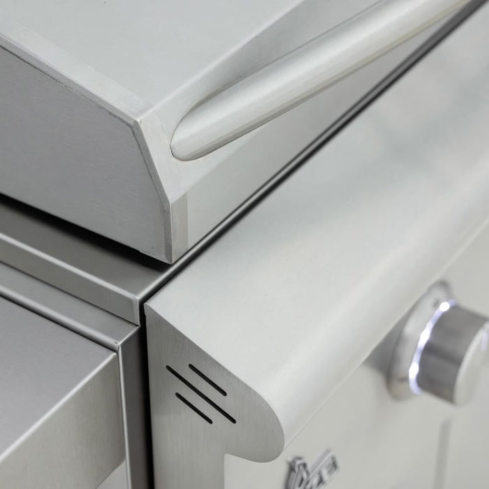 With a spring-assisted lid for effortless opening, a front-positioned drip tray for easy grease management, and upgraded LED-lit control knobs, this griddle is built for efficiency, safety, and ease of use. The stainless steel cart includes a pull-out propane tank holder, an internal storage shelf, soft-close doors, and four locking casters, making it easy to move and store grilling essentials.