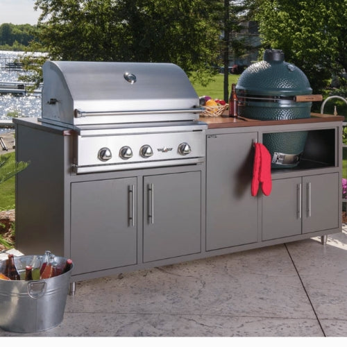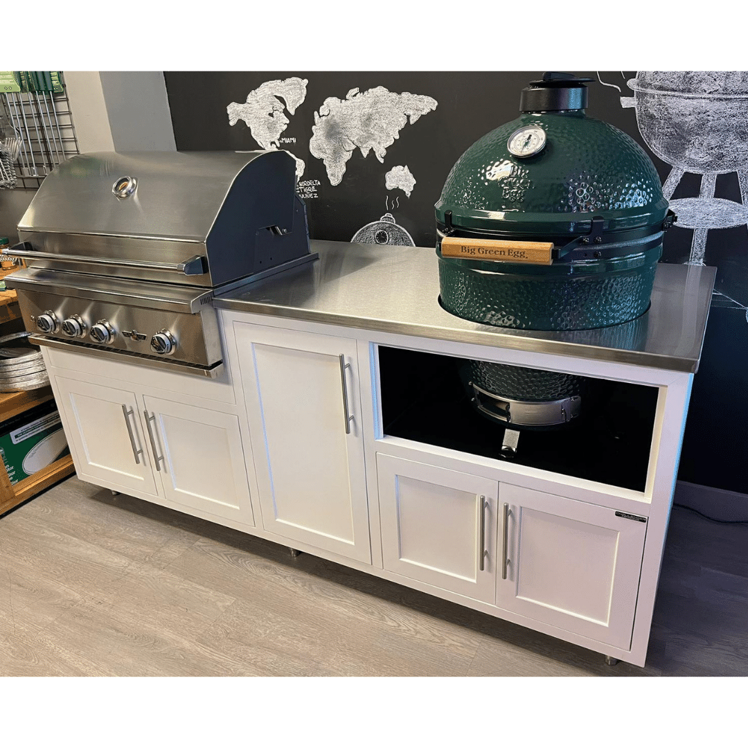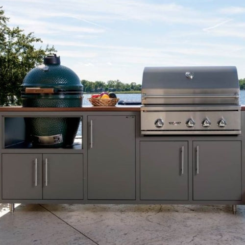 The versatile grill base is designed to accommodate grills of up to 32" or smaller, it's worth noting that this outdoor kitchen is also capable of accommodating larger appliances, such as the Big Green Egg Ceramic grill, ensuring that you have the flexibility to tailor your cooking space to your specific needs. Additionally, the kitchen offers flexibility in fuel options, accommodating both propane and natural gas setups. Whether you choose a 20 lb. LP tank or a natural gas connection, the Challenger Coastal Series can adapt to your needs seamlessly.