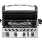 The Napoleon Built-In Prestige® 500 Gas Grill Head is an ideal addition to a custom outdoor kitchen, offering durability and style with its stainless steel construction. It features WAVE™ cooking grids for distinctive sear marks and SafetyGlow control knobs for safety indication. The grill's JETFIRE™ ignition system ensures consistent startup, while multiple burners enable versatile cooking styles. Additionally, the integrated infrared rear burner allows for rotisserie meals, and an optional charcoal tray adds the flavor of charcoal for grilling and smoking. For creative freedom in grilling, the Prestige® 500 Grill Head is a top choice.