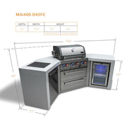 The MAi400-D45FC offers superior grilling performance with four burners, infrared side and rear burners, and a lockable outdoor-rated fridge with LED lighting and temperature controls. It includes essential accessories like a heavy-duty rotisserie kit, granite chopping board, and full-size weather cover. LED knob lights and bright internal cooking lights ensure easy control and perfect vision, even during nighttime grilling.