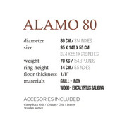 Experience professional-grade grilling with our compact Alamo 80 grill, blending comfort and functionality seamlessly. With a diameter of 31.49 inches and a height of 21.65 inches, weighing 154.32 lbs, it's the epitome of versatility in a compact design. Crafted from premium iron and wood materials, this grill exudes elegance and durability, making it the perfect addition to any outdoor space. Complete with a wooden surface and rusted finish ring & wheels, it offers convenience and mobility for your grilling needs.
