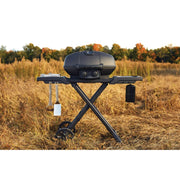 Portable grilling like no other, the Phantom TravelQ™ PRO285 Portable Propane Gas Grill with scissor cart is a luxurious matte black and hides many secrets. From the top of the lid to the cart, this portable gas barbecue is silky matte black. The edgy Phantom TravelQ™ Portable Gas Grill features a high top lid and two stainless steel burners to take portable grilling to the gourmet level. Barbecue up to 20 hamburgers or roast succulent turkeys, whole chickens, and even prime rib. The included warming rack with an innovative hinge design allows the rack to flip back when not in use to provide full access to the main cooking grids. It's perfect for warming or providing additional cooking area. A nimble, matte black, folding cart features all-terrain wheels, easy setup, compact storage, and propane tank straps. The deep and dark Phantom TravelQ™ PRO285 Portable Propane Gas Grill is more than just a look. It's a lifestyle.