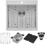 • INCLUDED IN BOX: Sink, stainless steel colander, solid black polymer cutting board, stainless steel bottom rinse grid, and basket strainer drain assembly.