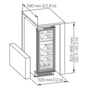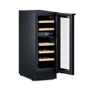 Enhance your kitchen with the Dometic Wine Cooler D18B, a 12-inch dual-zone wine cooler that effortlessly combines style and functionality. Perfect for both freestanding and built-in installations, this cooler accommodates 18 Bordeaux bottles, beautifully displayed on FSC-certified wooden shelves. It features five removable and sliding wood racks, an adjustable height with customizable feet and plinth, and a reversible door for flexible placement. The triple-pane, low-emission glass door shields your wine from UV damage, while the integrated carbon filter and automatic humidity control ensure optimal storage conditions. Enjoy minimal maintenance with its automatic defrosting system and low-vibration compressor.