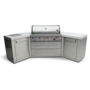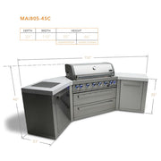 The MAi805-45 features six standard-sized burners, an infrared side burner, and an infrared rear burner for superior rotisserie cooking capabilities. The 45-degree angle modules provide extra prep space and create a striking appearance on your patio or yard.