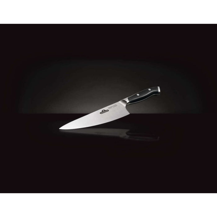 Use the Chef's Knife by Napoleon and you will never want to use another knife to prep your meals again. This German steel blade is razor sharp; easily gliding through whatever food you are working with. The ideal, all-purpose Chef's Knife will meet all of your cooking needs. The forged stainless steel runs the full length of the knife; the It is balanced from tip, all the way through the tang. The dual riveted handle provides ergonomic comfort while you slice, chop, dice, and mince. So whether you are a gourmet grill master, or a fanatical foodie, this Chef's Knife is perfect for all of your food prep needs.