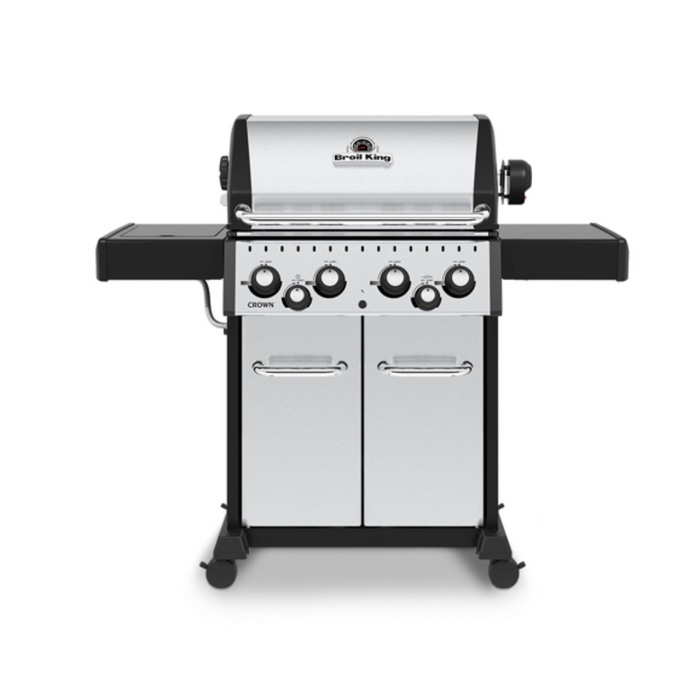 The Broil King® Crown™ 400 Series features 460 sq. in. primary cooking surface and includes a durable cast aluminum oven, 4 stainless steel Dual-Tube™ burners, stainless steel Flav-R-Wave™ cooking system, and electronic ignition. All Crown 400 series include heavy-duty 3-position cast iron cooking grids, black drop-down side shelves and enclosed black cabinet base.