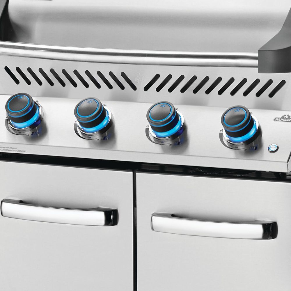 illuminated with blue LED lights, that change to red when gas is on making it easier and safer to grill after dark.